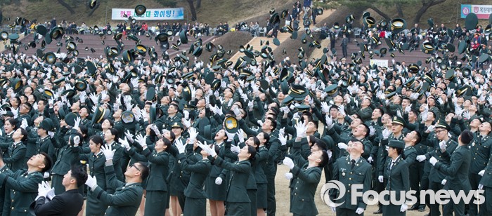 (계룡=포커스뉴스) 4일 오전 충남 계룡대 연병장에서 열린 2016년 장교 합동임관식 리허설에서 신임장교들이 정모를 하늘로 던지고 있다.