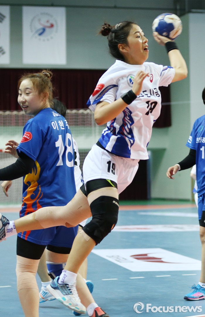 (인천=포커스뉴스) 4일 인천선학체육관에서 열린 2016 SK 핸드볼 코리아리그 여자부 인천시청-광주도시공사 경기에서 광주도시공사 김지희가 인천시청 이현주의 수비를 따돌리고 슈팅을 하고 있다.