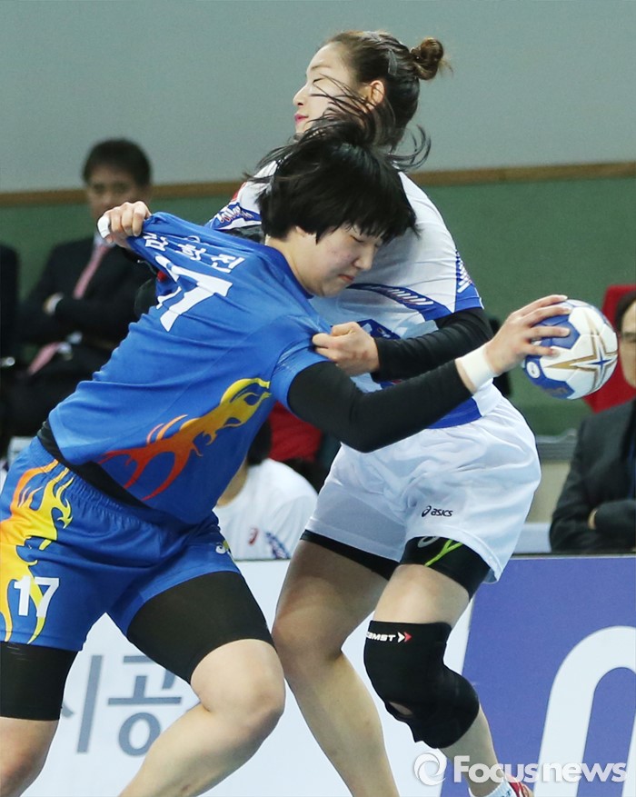 (인천=포커스뉴스) 4일 인천선학체육관에서 열린 2016 SK 핸드볼 코리아리그 여자부 인천시청-광주도시공사 경기에서 광주도시공사 김혜원이 인천시청 김희진의 돌파를 유니폼을 잡아 당기며 저지하고 있다.