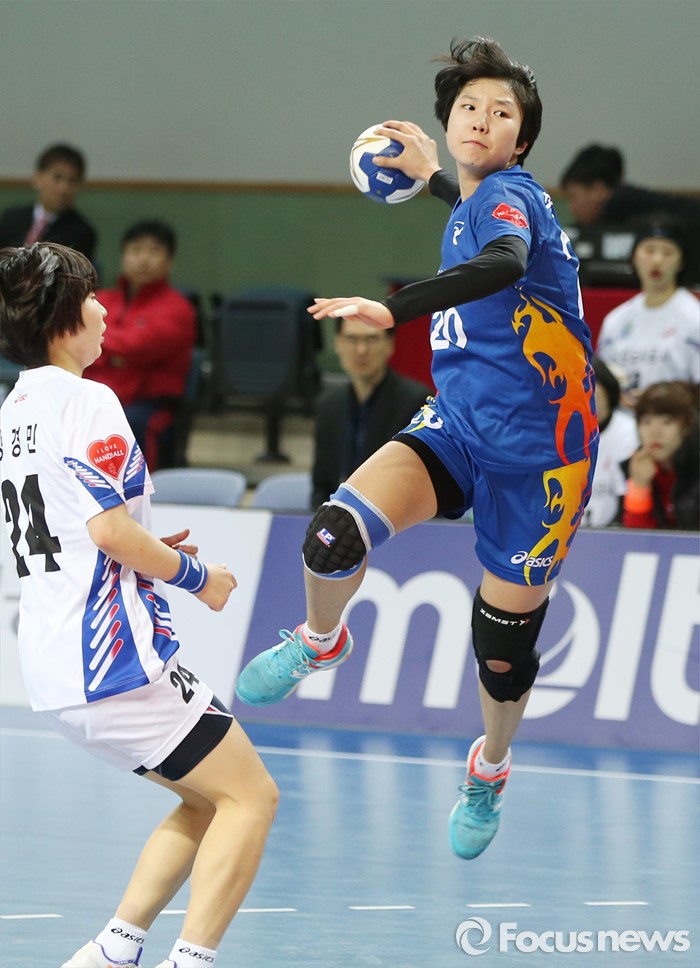 (인천=포커스뉴스) 4일 인천선학체육관에서 열린 2016 SK 핸드볼 코리아리그 여자부 인천시청-광주도시공사 경기에서 인천시청 송해리가 광주도시공사 강경민의 수비를 뚫고 슈팅하고 있다.