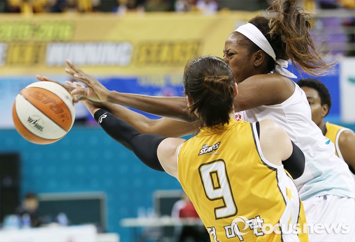 (부천=포커스뉴스) 6일 부천체육관에서 열린 2015-2016 여자프로농구 KEB하나은행-KB스타즈 경기에서 KEB하나 버니스 모스비가 KB스타즈 정미란의 마크를 피하며 패스하고 있다.