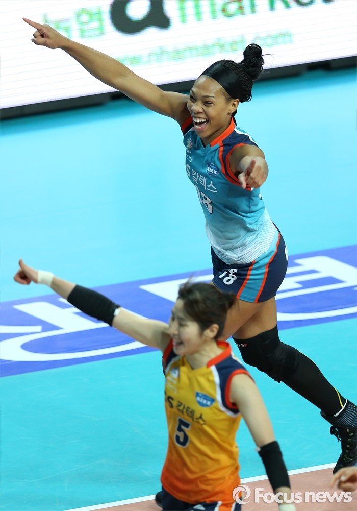 IBK기업은행은 비록 패했지만 김희진의 활약이 반갑다. 손가락 부상 뒤 복귀한 김희진은 챔피언결정전을 대비해 경기감각을 끌어올리는 중이다. 이날 김희진은 21득점을 올리며 건재함을 과시했다. 김희진은 외국인선수 맥마혼과 함께 IBK기업은행 정규시즌 우승을 이끈 주역이다. 김희진과 맥마혼이 없는 가운데 팀을 지켰던 박정아도 15득점으로 힘을 냈다.(서울=포커스뉴스) 19일 장충체육관에서 열린 '2015-2016NH농협 V-리그' 여자부 GS칼텍스-흥국생명 경기에서 GS칼텍스 캣벨이 스파이크를 성공시키고 환호하고 있다. 2016.01.19 우정식 기자