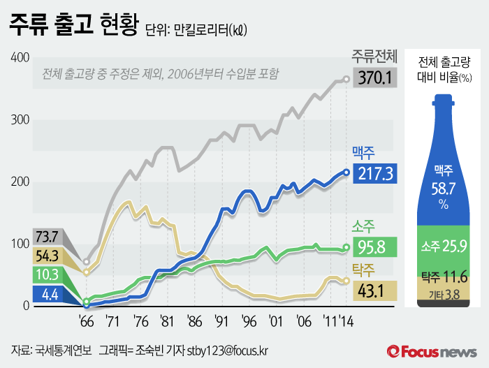 지난 50년간 막걸리 전체 출고량은 5배 증가하는데 그쳤으나 맥주는 50배 급증했다.