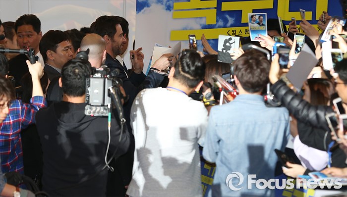 (서울=포커스뉴스) 7일 오후 서울 영등포구 IFC몰 광장에서 열린 영화 '독수리 에디' 레드카펫 행사에 참석한 배우 휴 잭맨이 팬들에게 사인을 해주고 있다.