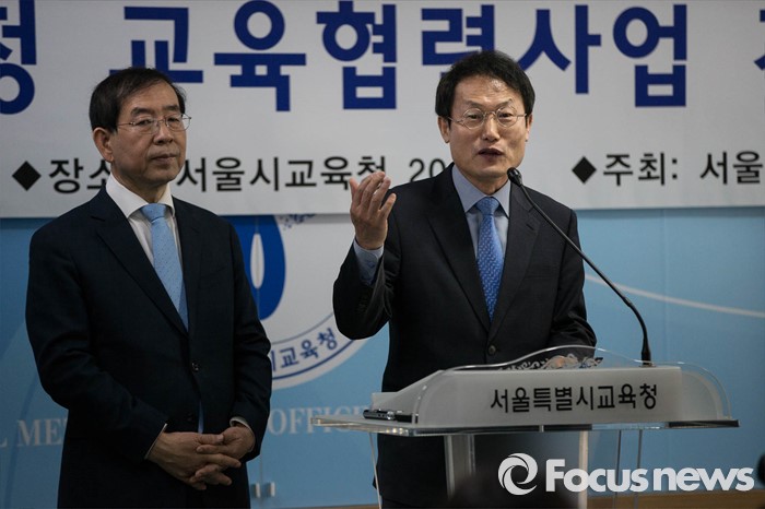 (서울=포커스뉴스) 조희연 서울시교육감이 8일 오전 종로구 서울시교육청에서 열린 '서울시-교육청 교육협력사업 기자회견'에 참석해 발언하고 있다. 왼쪽은 박원순 서울시장.