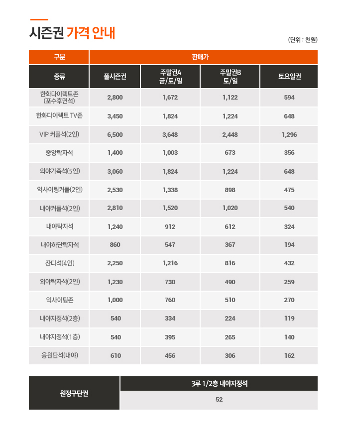 한편 시범경기 주말경기는 전좌석 정상요금의 50%에 판매된다. 9일부터 예매할 수 있다.프로야구 한화가 시즌권 판매를 시작한다. 사진은 한화 시즌권 가격안내. <사진제공=한화 이글스>
