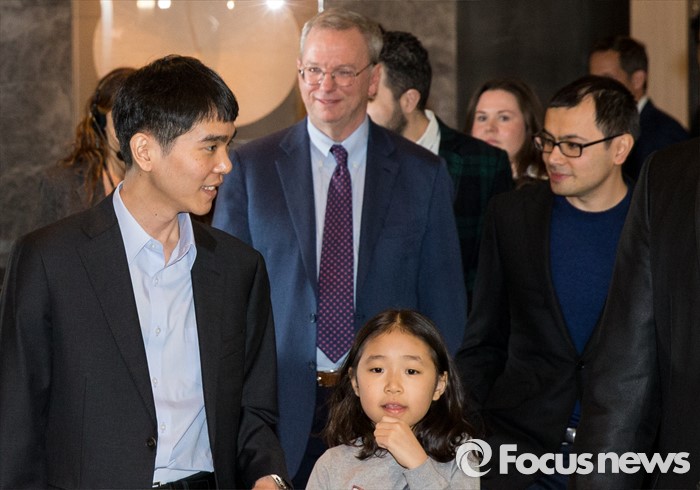 (서울=포커스뉴스) 9일 오후 서울 종로구 포시즌스 호텔에서 열린 '구글 딥마인드 챌린지 매치'에서 이세돌 9단이 딸 혜림양과 함께 대국장으로 향하고 있다. 뒤는 에릭 슈미트(왼쪽) 구글 회장과 데미스 하사비스 구글 딥마인드 최고경영자.