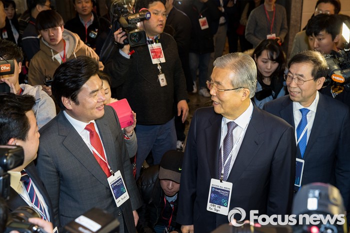 (서울=포커스뉴스) 9일 오후 서울 종로구 포시즌스 호텔에서 열린 이세돌 9단과 알파고의 '구글 딥마인드 챌린지 매치'에 참석한 원유철(왼쪽) 새누리당 원내대표와 김종인 더불어민주당 비상대책위원회 대표가 대화하고 있다.
