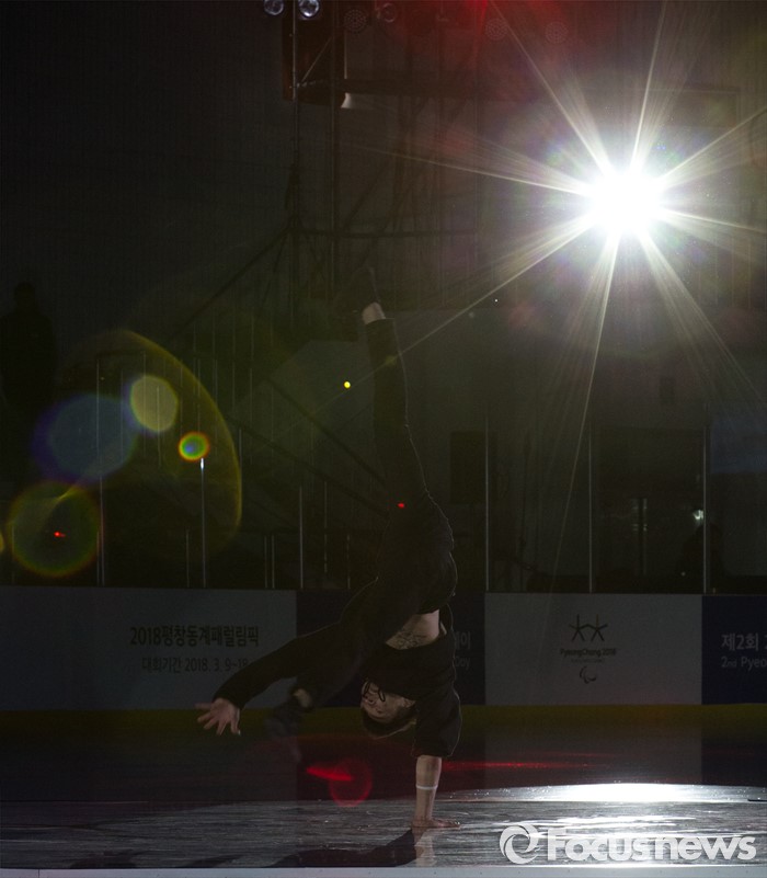 (춘천=포커스뉴스) 9일 오후 강원 춘천의암빙상장에서 클라이맥스 크루가 제2회 2018 평창 패럴림픽 데이를 축하하며 비보잉 공연을 선보이고 있다.