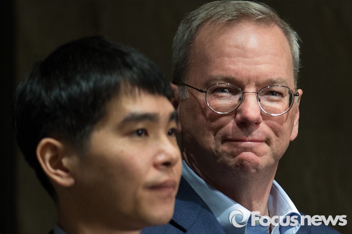 (서울=포커스뉴스) 9일 오후 서울 종로구 포시즌스호텔에서 에릭 슈미트(오른쪽) 구글 회장이 바둑기사 이세돌 9단과 인공지능 바둑프로그램 알파고와의 첫번째 대국 후 미소를 짓고 있다. 사진 왼쪽은 이세돌 9단.