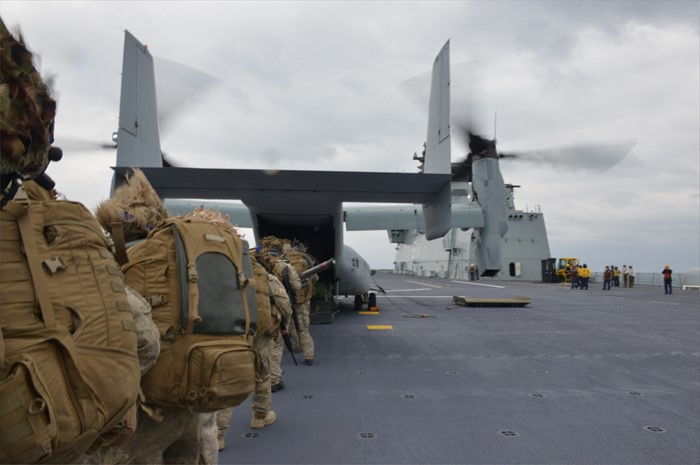 (서울=포커스뉴스) 2016년 쌍룡훈련에 참가한 뉴질랜드 육군 장병들이 지난 9일 독도함에서 미 해병대 MV-22 오스프리를 이용한 공중돌격훈련을 하고 있다. <사진제공=해군>