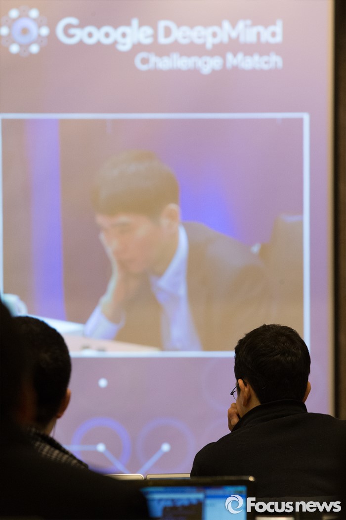(서울=포커스뉴스) 이세돌 9단이 인공지능 알파고에게 충격의 2연패를 당했다.(서울=포커스뉴스) 10일 오후 서울 종로구 포시즌스호텔 기자실에서 취재진들이 이세돌 9단과 구글 인공지능 알파고의 '구글 딥마인드 챌린지 매치' 2차 대국을 지켜보고 있다. 2016.03.10 허란 기자