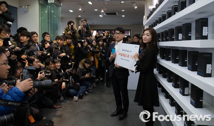 (서울=포커스뉴스) 11일 오전 서울 종로구 종각 T월드 카페에서 삼성 갤럭시 S7 론칭행사에 참석한 전 피겨국가대표 김연아(오른쪽)와 1호 개통자 이건희씨가 포토타임을 갖고 있다.