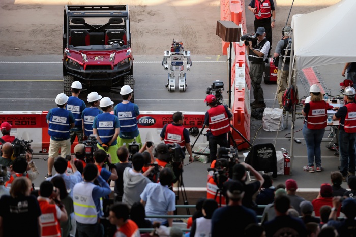 2015년 6월 5일 미국 캘리포니아주 포모나에서 열린 DARPA 주최 롯봇 경연대회에서 한국 카이스트 연구팀이 제작해 출전시킨 휴보 로봇이 작동하는 모습을 취재진이 지켜보고 있다. 전 세계에서 24개 팀이 참가한 이 대회에서 카이스트 팀이 1등을 차지했다.(Photo by Chip Somodevilla/Getty Images)