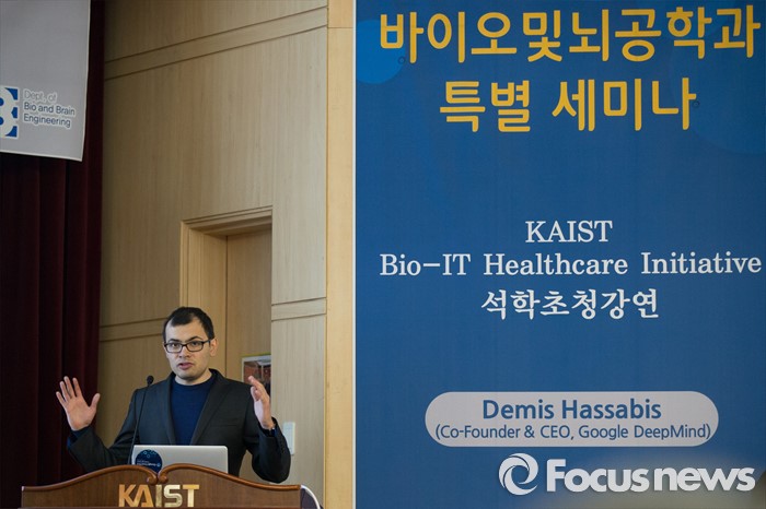 (대전=포커스뉴스) 이세돌 9단과 겨루는 인공지능 컴퓨터 알파고를 개발한 구글 딥마인드 최고경영자 데미스 하사비스가 11일 오후 대전 유성구 한국과학기술원(KIST)에서 '인공지능과 미래' 라는 주제로 강연을 하고 있다.