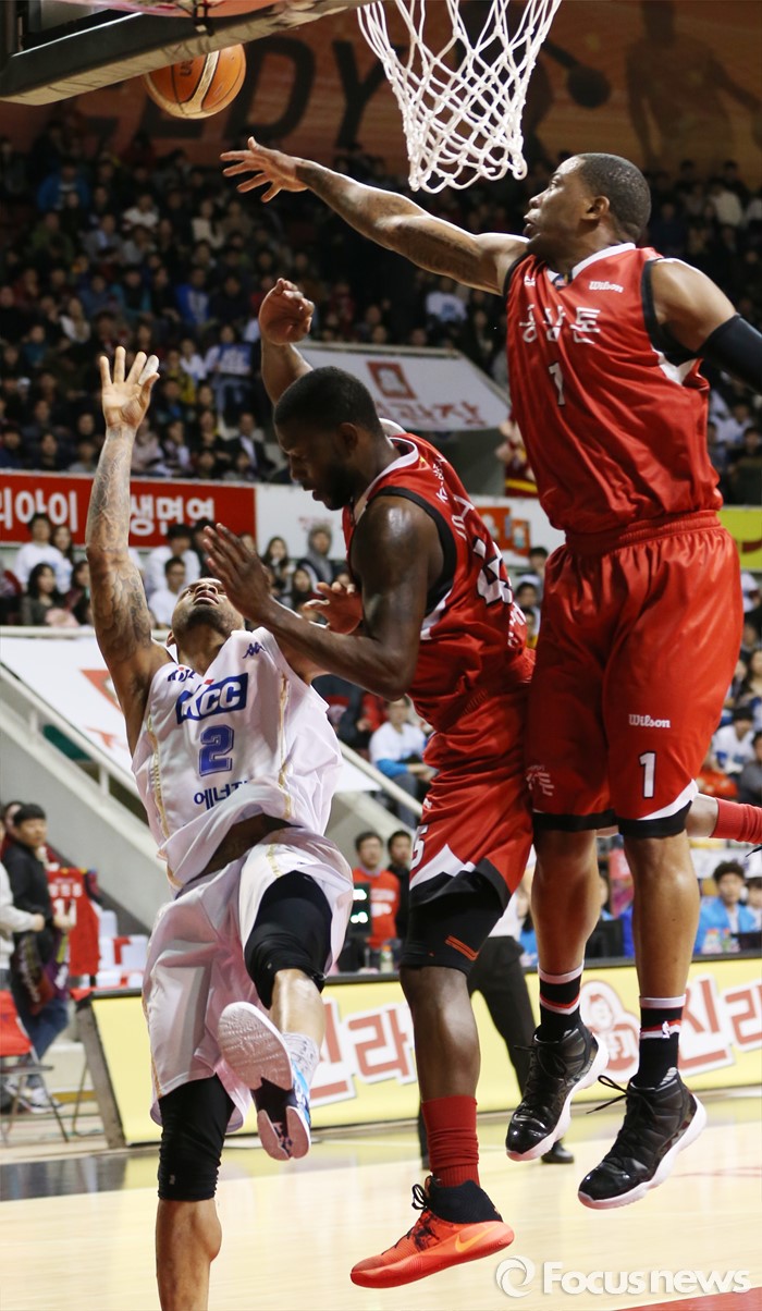 (안양=포커스뉴스) 11일 안양실내체육관에서 열린 2015-2016 프로농구 KGC-KCC 4강플레이오프 3차전에서 KCC 에밋의 슈팅을 KGC 찰스 로드와 마리오 리틀이 마크하고 있다.