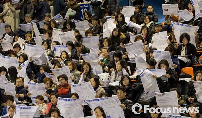 (서울=포커스뉴스) 12일 오후 서울 성동구 한양대학교 올림픽체육관에서 열린 '2017학년도 대학입시설명회'에 참석한 학부형, 수험생 및 관계자들이 주요 대학 배치참고표를 보고 있다.