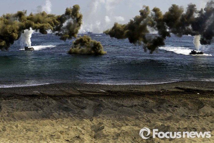 (포항=포커스뉴스) 12일 오후 경북 포항시 일대 해안에서 한미해병대의 연합상륙작전이 실시되었다. 해안가로 돌진하고 있는 상륙돌격장차들에서 일제히 연막을 전개하고 있다.