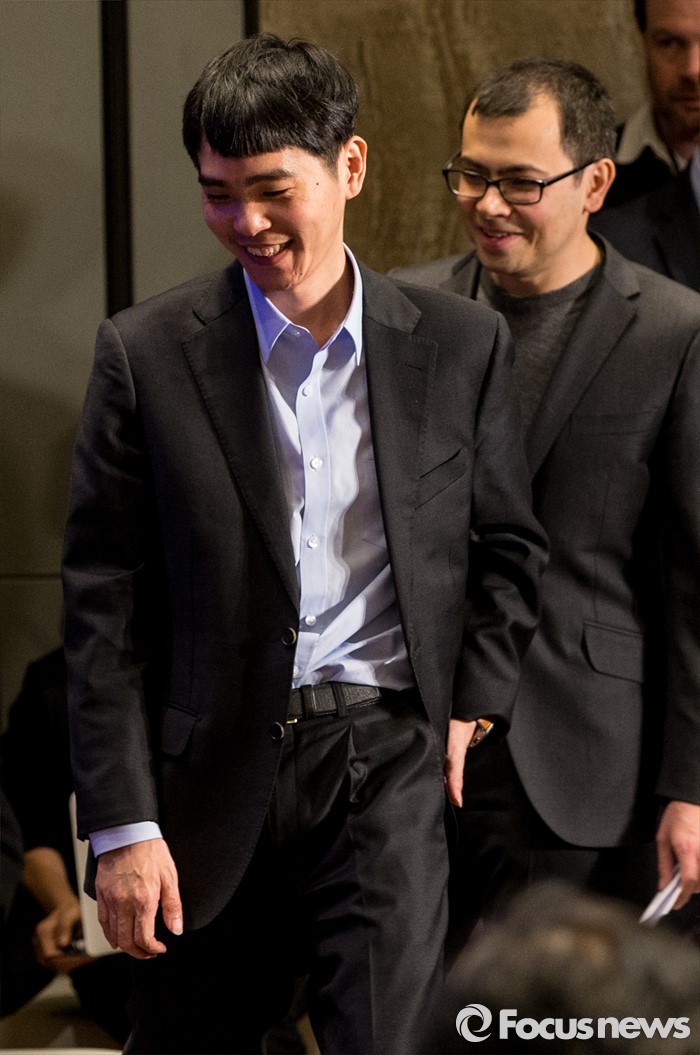 (서울=포커스뉴스) 12일 오후 서울 종로구 포시즌스호텔에서 열린 구글 딥마인드 챌린지 매치 제3국 기자회견에 참석한 이세돌) 9단(왼쪽), 데미스 하사비스 구글 딥마인드 대표가 무대에 오르고 있다.