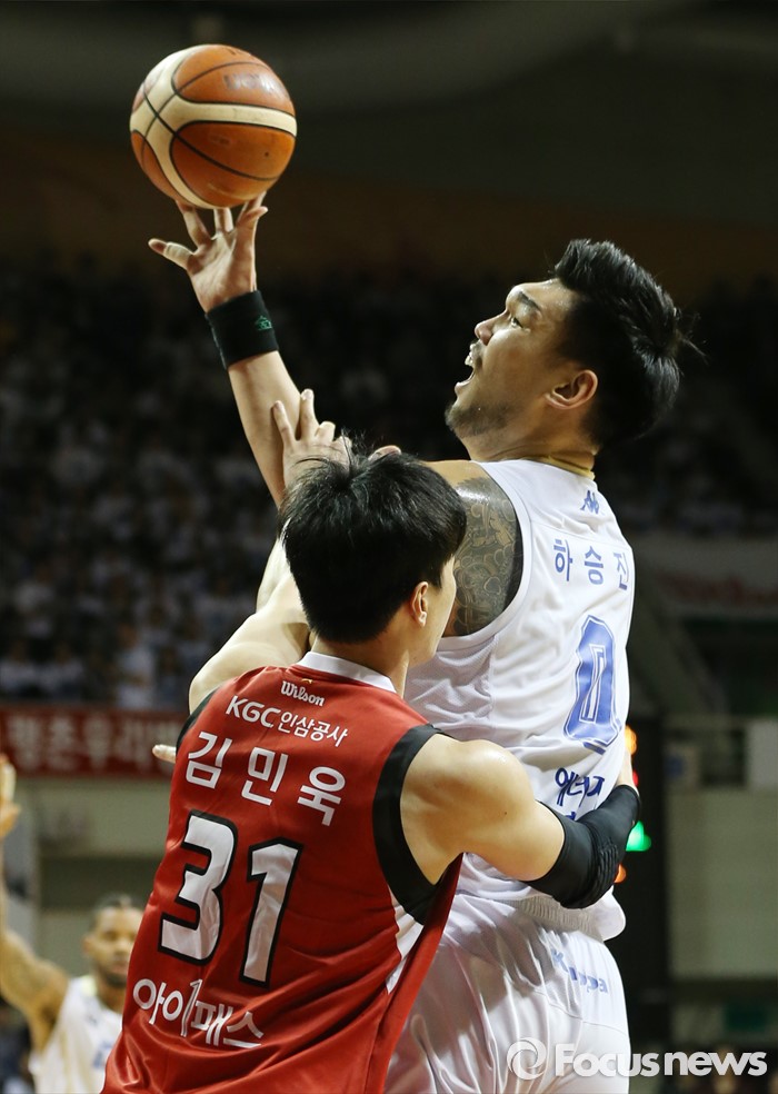 (안양=포커스뉴스) 13일 안양실내체육관에서 열린 2015-2016 프로농구 KGC-KCC 4강플레이오프 4차전에서 KCC 하승진이 KGC 김민욱의 마크를 제치며 슈팅을 하고 있다.