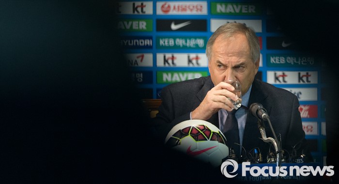 (서울=포커스뉴스) 14일 오전 서울 종로구 대한축구협회에서 울리 슈틸리케 한국축구대표팀 감독이 레바논과의 2018년 러시아월드컵 아시아지역 2차예선 7차전(24일 오후 8시·안산 와 스타디움)과 태국 원정(27일)에 출전할 대표팀 명단을 발표 후 물을 마시고 있다.