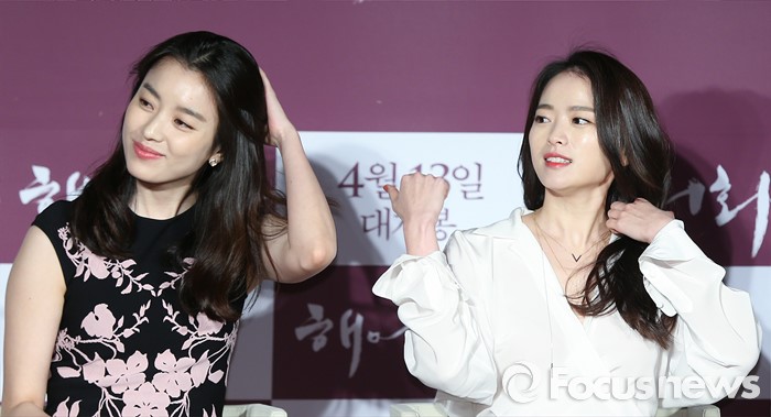 (서울=포커스뉴스) 14일 오전 서울 광진구 롯데시네마 건대입구점에서 열린 영화 '해어화' 제작보고회에 참석한 배우 한효주(왼쪽)와 천우희가 머리카락을 정돈하고 있다.