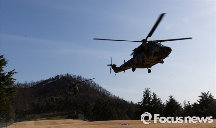 (대구=포커스뉴스) 10일 오후 제2작전사령부 예하부대에서 육군항공·특공부대 전개훈련에 참가한 201특공여단 장병들이 국산 헬기 수리온(KUH-1)을 이용해 작전지역에 침투하고 있다.