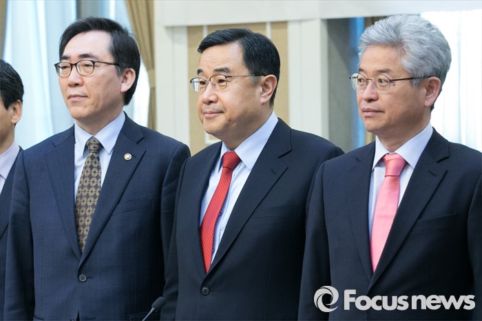 이날 당정협의에는 새누리당 김정훈 정책위의장·이철우 의원이 정부에서 조태열 외교부 2차관·황인무 국방부 차관·최종일 국정원 3차장 등이 참석했다.(서울=포커스뉴스) 조태열(왼쪽부터) 외교부 2차관과 김정훈 새누리당 정책위의장, 이철우 정보 정조위원장이 15일 오전 서울 여의도 국회 귀빈식당에서 열린 안보상황 점검 긴급 당정협의에 참석해 기념사진을 찍고 있다. 2016.03.15 박철중 기자