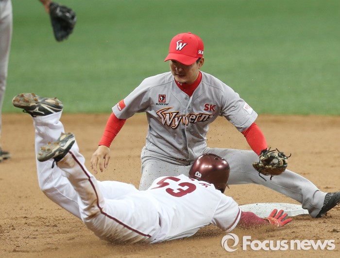 (서울=포커스뉴스) 15일 서울 고척스카이돔에서 열린 2016 프로야구 시범경기 SK-넥센 경기 6회 1사 1루에서 넥센 1루주자 고종욱이 2루 도루를 시도하다 아웃되고 있다.