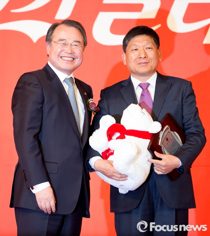 (서울=포커스뉴스) 16일 오전 서울 중구 더플라자호텔 그랜드볼룸에서 열린 제21회 코카콜라 체육대상 시상식에서 특별상을 수상한 육상 김국영을 대신해 아버지가 기념촬영을 하고 있다.