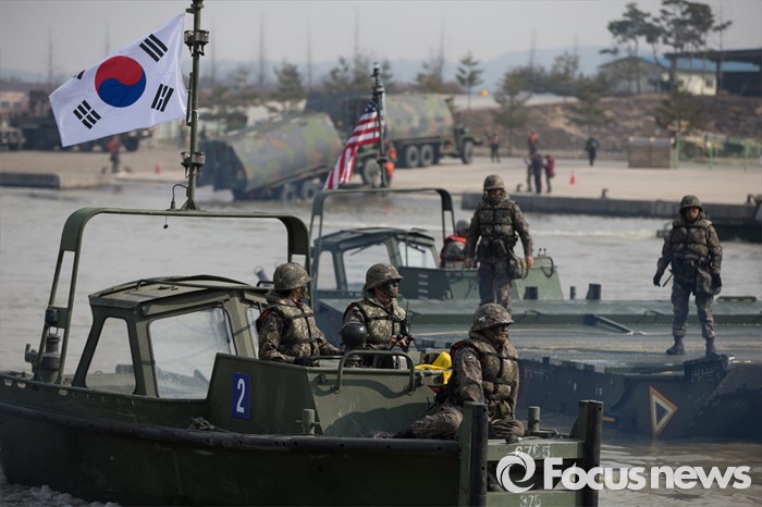 (이천=포커스뉴스) 16일 오전 경기도 이천시 7공병여단 도하훈련장에서 열린 '한·미 연합 소부대 도하훈련'에서 한국군 제7공병여단 도하대대와 미군 제2전투항공여단 공병대대 장병들이 부교 설치 작업을 하고 있다.