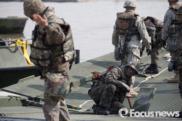 (이천=포커스뉴스) 16일 오전 경기도 이천시 7공병여단 도하훈련장에서 열린 '한·미 연합 소부대 도하훈련'에서 한국군 제7공병여단 도하대대와 미군 제2전투항공여단 공병대대 장병들이 부교를 설치하고 있다.
