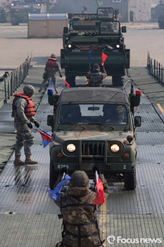 (이천=포커스뉴스) 16일 오전 경기도 이천시 7공병여단 도하훈련장에서 열린 한국군 제7공병여단 도하대대와 미군 제2전투항공여단 공병대대의 '한·미 연합 소부대 도하훈련'에서 전차와 장갑차들이 선두차량을 따라 부교를 도하하고 있다.