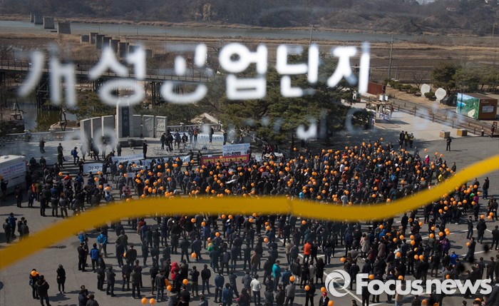 (파주=포커스뉴스) 16일 오후 경기도 파주시 임진각 망배단에서 개성공단 입주기업, 영업기업, 협력기업 등 대표를 비롯한 임직원과 가족들이 '개성공단 평화대행진 집회'를 하고 있다.