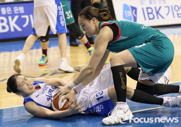 (춘천=포커스뉴스) 춘천호반체육관에서 열린 2015~2016 여자프로농구 우리은행-KEB하나 챔피언결정전 1차전에서 우리은행 이승아가 KEB하나 김정은에게 볼을 뺏기지 않으려 안간힘을 쓰고 있다.
