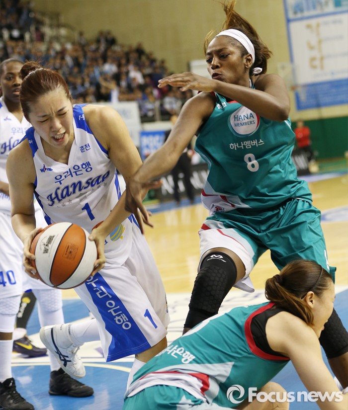 (춘천=포커스뉴스) 춘천호반체육관에서 열린 2015~2016 여자프로농구 우리은행-KEB하나 챔피언결정전 1차전에서 우리은행 양지희가 KEB하나 모스비에 앞서 튄공을 잡아내고 있다.