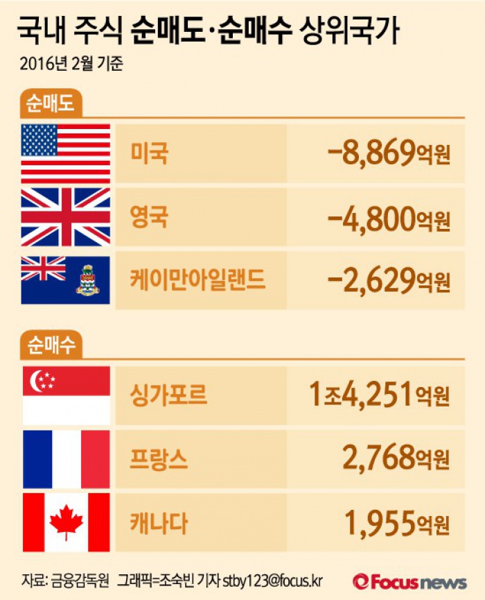 (서울=포커스뉴스) 17일 금융감독원에 따르면 주식시장에서 최대 순매도 국가는 미국, 영국, 케이만아일랜드 순이었고 최대 순매수 국가는 싱가포르, 프랑스, 캐나다 등이었다.