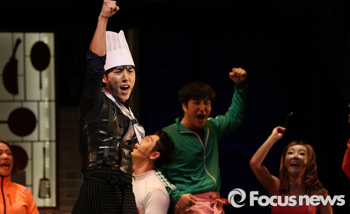 (서울=포커스뉴스) 3일 오후 서울 종로구 유니플렉스에서 열린 뮤지컬 '로멘틱 머슬' 프레스콜에 참석한 배우 백성현(왼쪽)이 주요장면을 시연하고 있다.