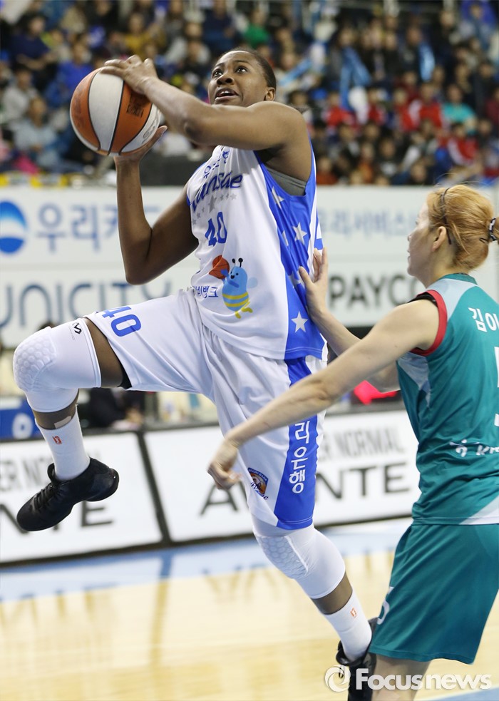 우리은행 스트릭렌은 3점슛 3개 포함, 27득점으로 양팀 최다 득점자가 됐다. 박혜진도 3점슛 4개 포함 17득점을, 양지희도 11득점을 각각 올렸다. KEB하나은행은 김정은이 18득점으로 분전했으나 첼시 리(6득점)와 모스비(7득점)이 1차전에 이어 2차전도 부진해 반전계기를 찾지 못했다.(춘천=포커스뉴스) 춘천호반체육관에서 열린 2015~2016 여자프로농구 우리은행-KEB하나 챔피언결정전 1차전에서 우리은행 스트릭렌이 KEB하나 김이슬의 마크를 피하며 점프슛을 시도하고 있다. 2016.03.16 우정식 기자