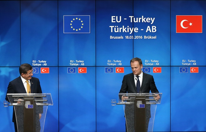 아흐메트 다부토글루 터키 총리(왼쪽)와 유럽연합(EU) 정상회의 상임의장이 18일(현지시간) 벨기에 브뤼셀의 EU 본부에서 터키-EU간 협상 타결을 알리는 기자회견을 열고 있다.(Photo by Carl Court/Getty Images)