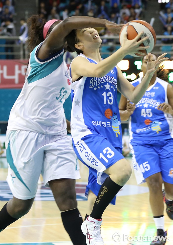 (부천=포커스뉴스) 20일 부천체육관에서 열린 2015-2016 여자프로농구 챔피언결전전 3차전 KEB하나은행-우리은행 경기에서 우리은행 이승아의 레이업슛을 KEB하나 첼시 리가 뒤에서 블록하고 있다.