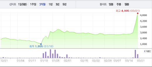21일 오전 9시51분 현재 대한전선은 전일대비 무려 27.32%(1060원) 오른 4990원에 거래되고 있다. 이는 52주 최고가였던 3900원을 깨는 기록이다.