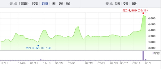 디피씨는 이날 오전 11시19분 현재 전일 대비 0.92%(45원) 하락한 4865원에 거래 중이다. 소폭의 하락세를 보이고 있지만 15일을 제외하고 6거래일 연속 상승 마감하며 순항 중이다. 전 거래일인 18일에는 11.5% 상승한 4910원에 거래를 마친 바 있다.