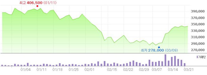 그는 또 "최근 동원데어리푸드 편입, 동원홈푸드의 삼조셀텍 흡수합병 등이 진행된 이후 참치캔 기여도가 절대적이었던 수익 구조가 달라졌다"고 분석했다.최근 3개월간 동원F&B 주가 추이 <그래픽출처=네이버>