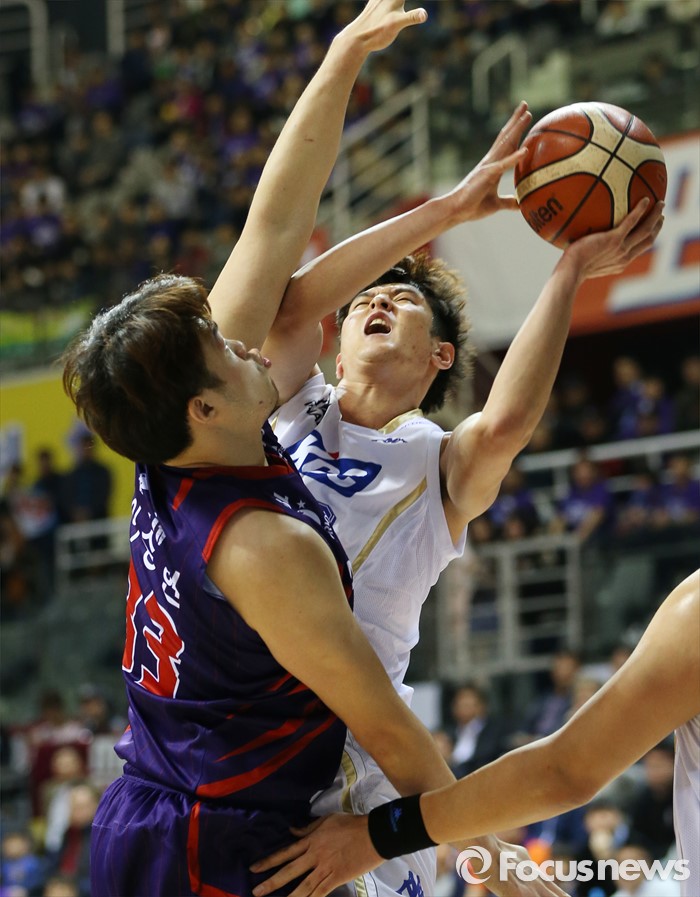 (고양=포커스뉴스) 23일 고양체육관에서 열린 2015-2016 프로농구 챔피언결정전 3차전 오리온-KCC경기에서 오리온 이승현이 KCC 정희재의 슈팅을 막고 있다.