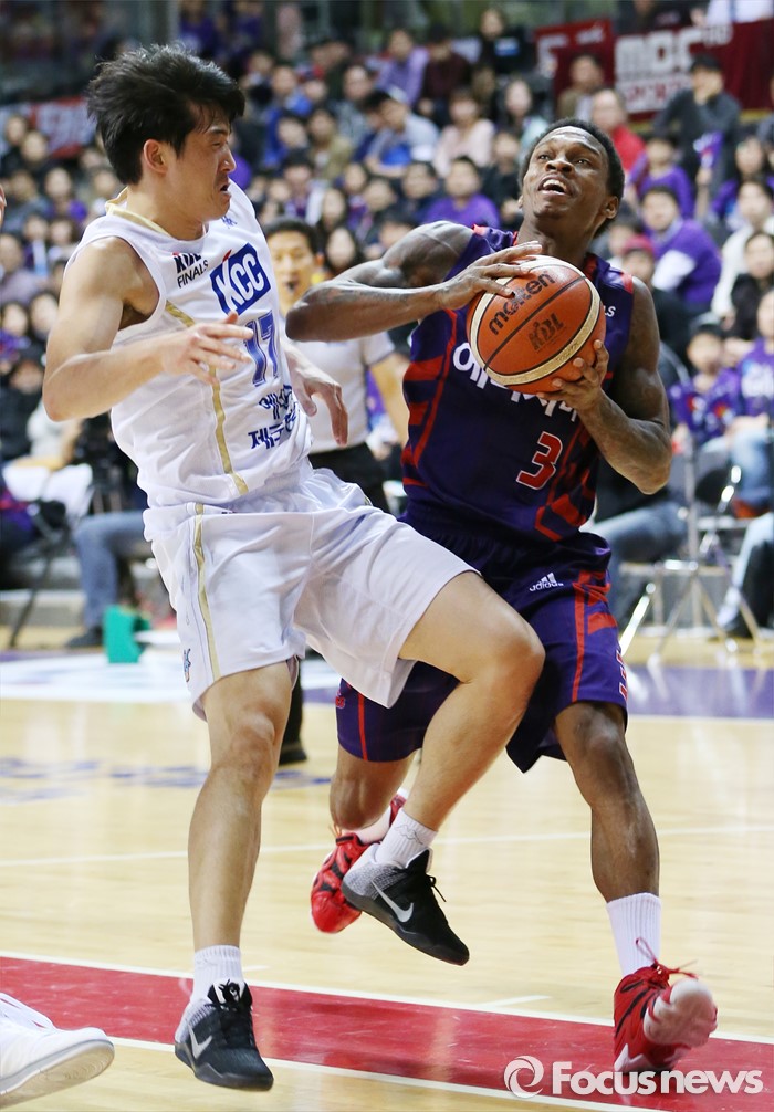 (고양=포커스뉴스) 23일 고양체육관에서 열린 2015-2016 프로농구 챔피언결정전 3차전 오리온-KCC경기에서 오리온 조 잭슨이 KCC 신명호의 수비를 뚫으며 골밑 슛을 노리고 있다.