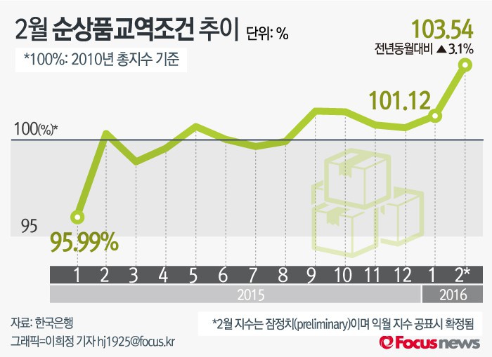 (서울=포커스뉴스) 23일 한국은행이 발표한 '2월 무역지수 및 교역조건'을 보면 순상품교역조건지수는 전년 동월 대비 3.1% 오른 103.54(2010년 100기준)로 집계됐다.