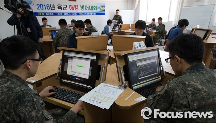 (대전=포커스뉴스) 24일 오후 대전 유성구 자운대 국군정보통신학교에서 열린 2016년 육군 해킹 방어대회에 참가한 장병과 학생들이 문제풀이를 하고 있다.