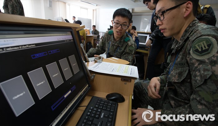 (대전=포커스뉴스) 24일 오후 대전 유성구 자운대 국군정보통신학교에서 열린 2016년 육군 해킹 방어대회에 참가한 장병과 학생들이 문제풀이를 하고 있다.