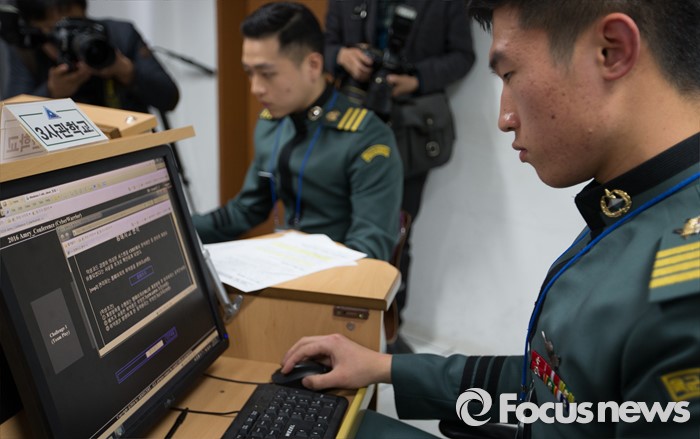 (대전=포커스뉴스) 24일 오후 대전 유성구 자운대 국군정보통신학교에서 열린 2016년 육군 해킹 방어대회에 참가한 장병과 학생들이 문제풀이를 하고 있다.